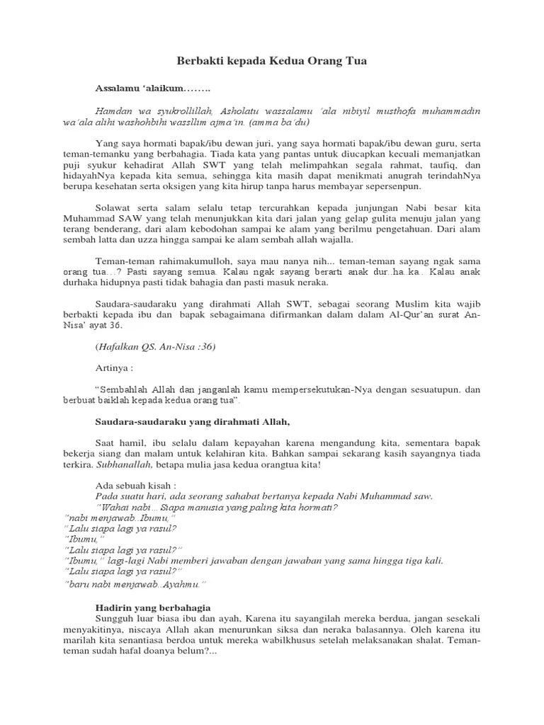اَلسَّلاَمُ عَلَيْكُمْ وَ رَحْمَةُ اللّهِ وَ بَرَكَاتُهُ. Pin di alex pin di teks pidato berbakti kepada orang tua contoh teks ceramah. صَلاَةً وَ سَلاَمًا دَائِمَيْنِ عَلَى رَسُوْلِ . Materi pildacil berbakti kepada kedua orang tua pondok. Pidato berbakti kepada orang tua.